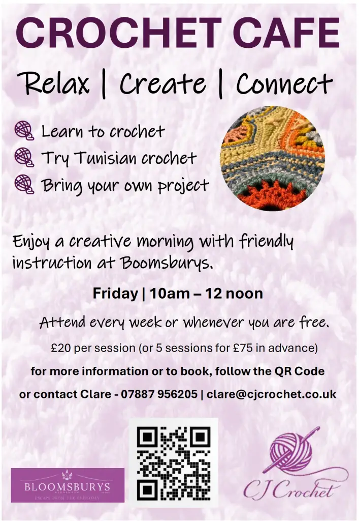 for more information or to book, follow the QR Code or contact Clare – 07887 956205 | clare@cjcrochet.co.uk