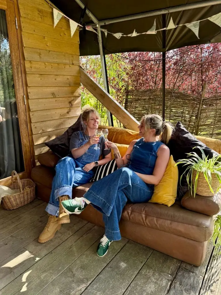 This season, we have added a kitchenette to our Safari Lodge, complete with a sink, induction hob, toaster, fridge, freezer compartment, and kettle. Even on rainy days, you can enjoy the comforts of home. An undercover area next to the fire pit, equipped with a gas-fired BBQ, provides a magical space to spend your evenings, lit by fairy lights.